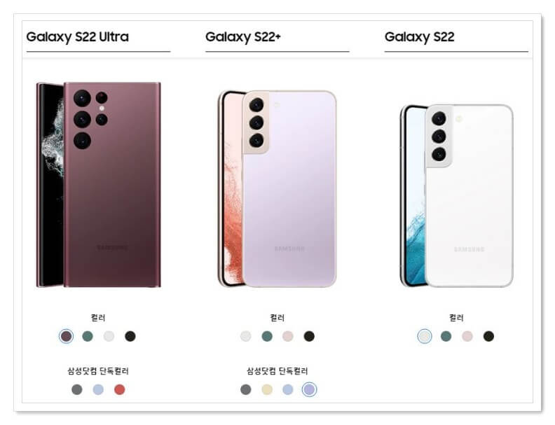 - 갤럭시 S22 울트라 : 그린, 버건디, 팬텀 화이트, 팬텀 블랙, 그라파이트, 스카이 블루, 레드