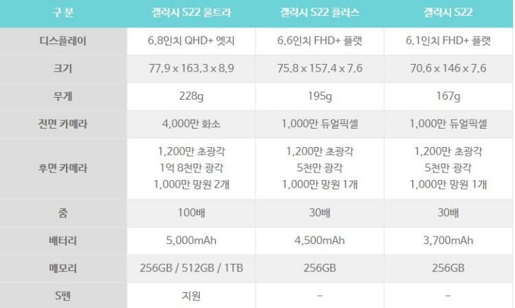 2. 갤럭시 S22 스펙(S22 vs 플러스 vs 울트라)