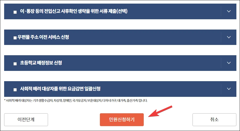 - 우편물 주소 이전 서비스 : 전에 살던 주소로 우편물 배송 시, 전입신고 주소로 배달(관내 3개월 무료)