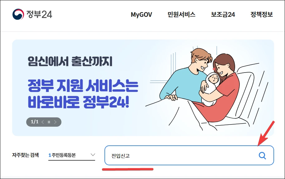 우선 정부24 홈페이지 메인 화면에서, 검색창에 전입신고를 입력하고 검색을 누릅니다.