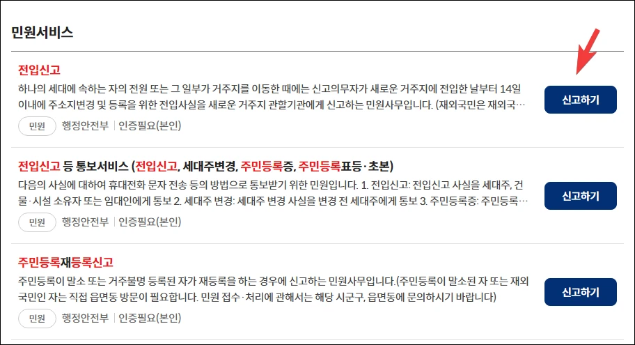 조회 결과 확인 후, 민원 서비스에서 전입신고 '신고하기' 버튼을 클릭합니다.