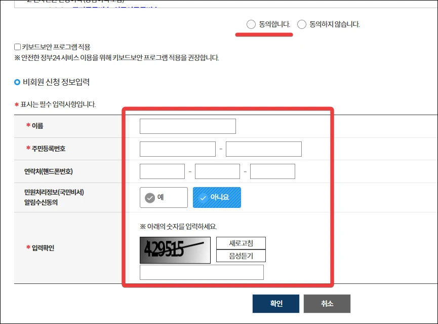 비회원으로 신청했을 때는 아래와 같이 개인 정보를 별도로 입력해야 하는데요. 입력 후 확인을 누르면 됩니다.