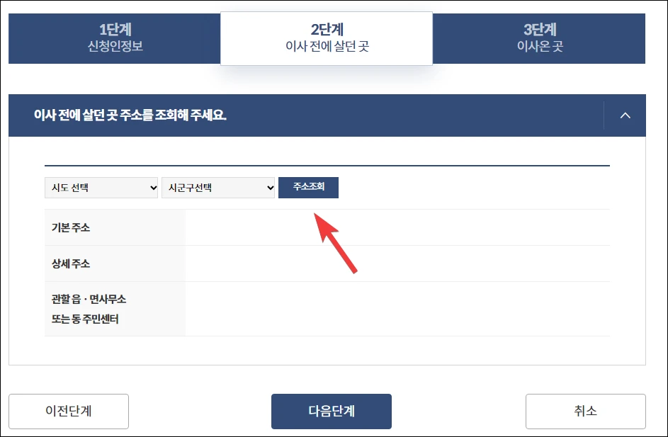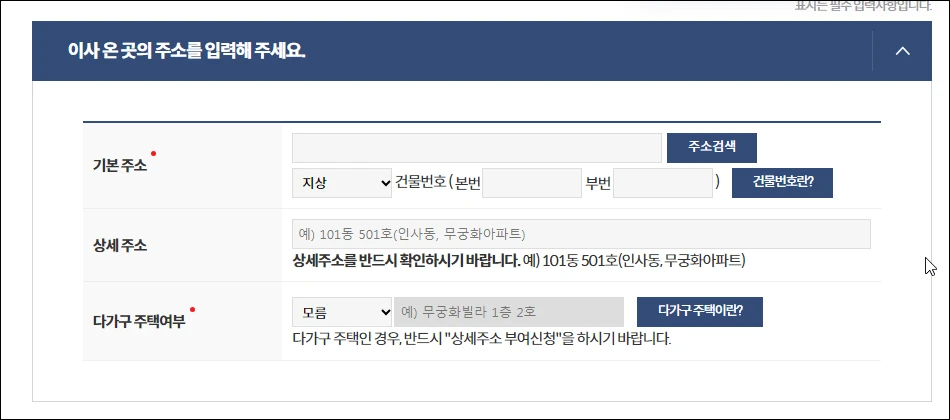 그다음 새로 이사할 집의 주소를 입력합니다. 참고로 다가구 주택의 경우 상세주소를 기입해야 합니다(예 : xx빌라 1층 2호).