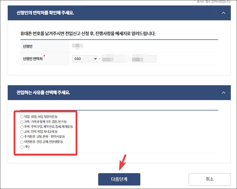3) 전입 사유 선택