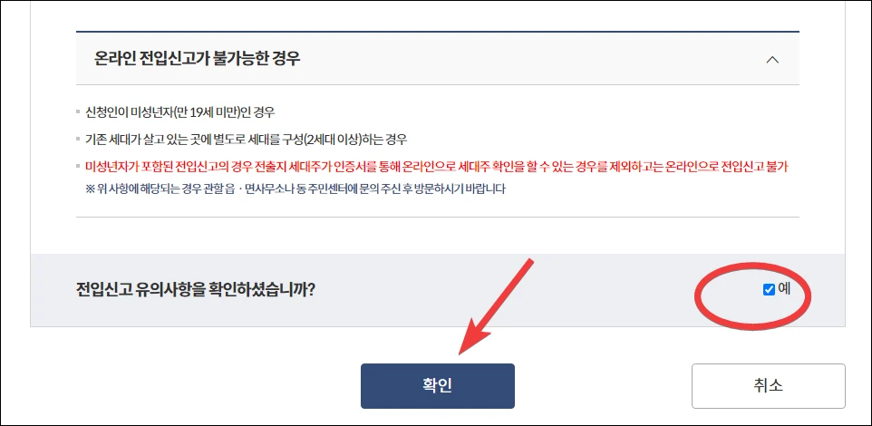 전입 신고 관련 유의 사항을 읽은 후 확인했다고 체크하고 '확인'을 누릅니다.
