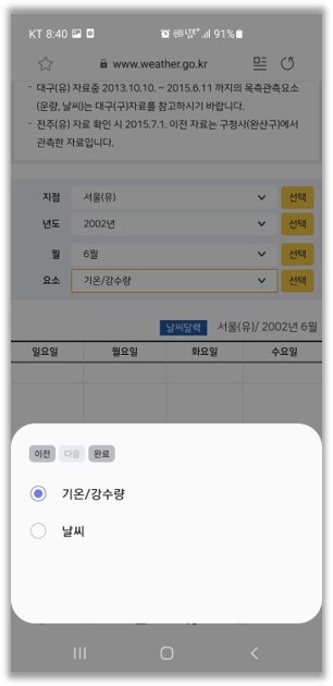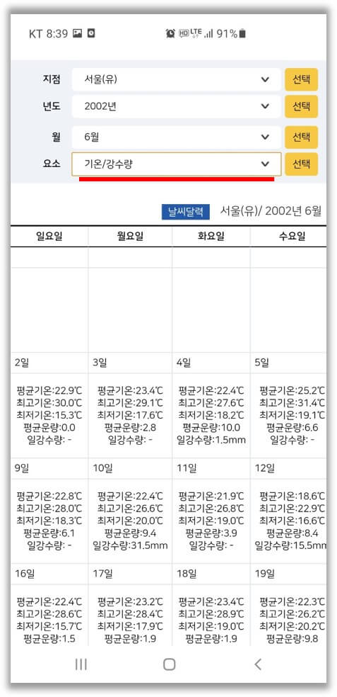 지역과 년도/월을 선택하면 아래와 같이 과거 특정한 날의 기온/강수량 등을 확인할 수 있습니다. 방학에 밀린 일기 쓸 때 이게 있었으면 얼마나 좋았을까요. 🤣
