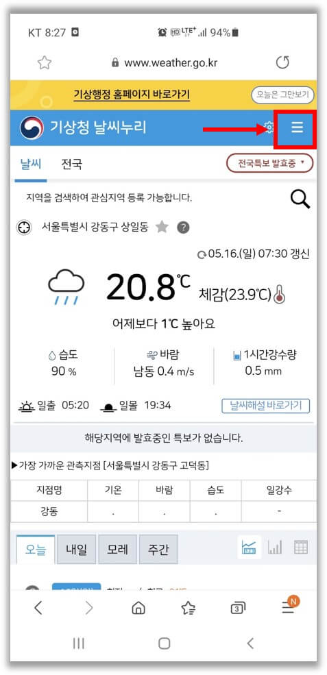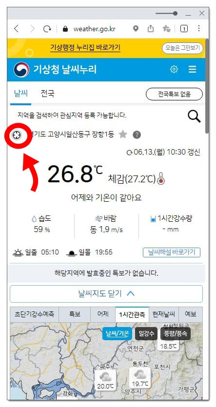 기상청 날씨누리 사이트에서도 현위치 날씨 어플 없이 확인이 가능합니다. 기상청 날씨누리는 포털보다 좀 더 자세한 날씨정보를 확인할 수 있어요.