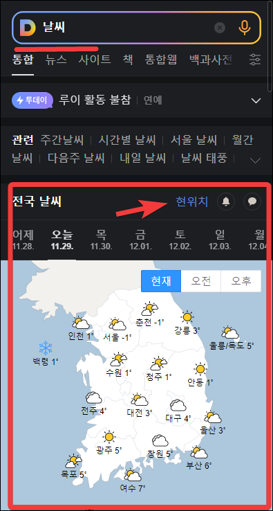 먼저 다음의 경우 예를 들어볼게요. 검색창에서 '날씨'라고 입력하면 다음과 같이 현재 전국 날씨 현황이 한눈에 조회됩니다. 현위치를 눌러 내 주변(동) 날씨를 확인할 수도 있어요.