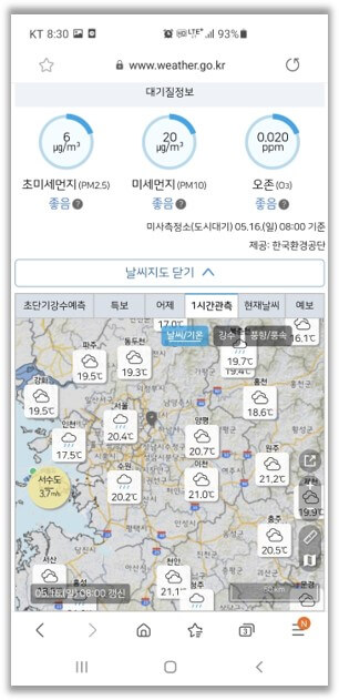 그 밑에는 대기질 정보가 나옵니다. 요새 매우 중요해진 미세먼지 정보를 실시간(1시간 단위)으로 제공하고 있네요.