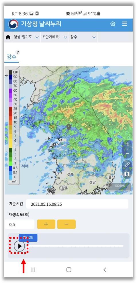 전국 강수량 현황이 지도에 나오는데요. 재생속도를 설정하고 플레이 버튼을 누르면 비구름이 움직이면서 예상 강수량이 어떻게 바뀌는지 확인해 볼 수 있습니다.