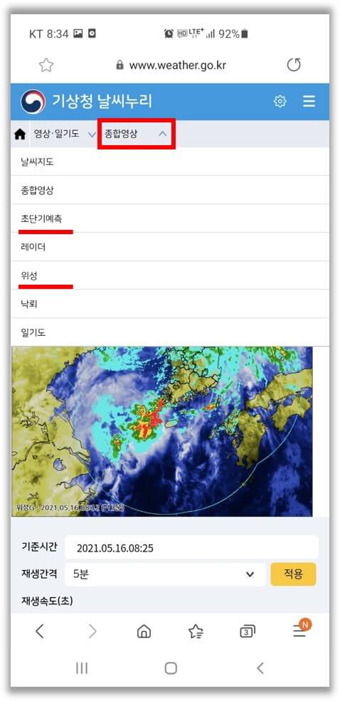 영상·일기도를 선택하면 날씨지도, 종합영상, 초단기예측, 위성영상 등의 정보를 확인할 수 있습니다. 우선 종합영상을 눌러보겠습니다.