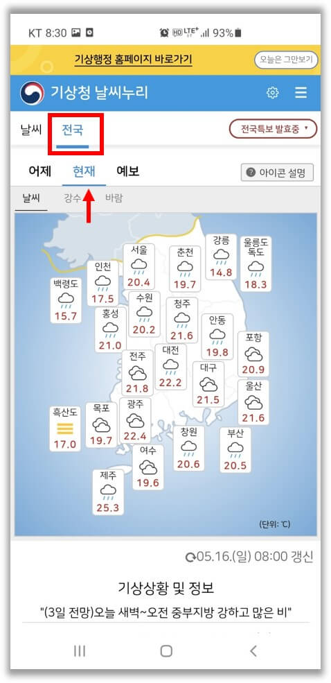 메인 페이지에서 '전국' 탭으로 이동하면, 현재 전국의 날씨 현황을 한눈에 확인할 수 있습니다. '날씨' 정보를 '강수'나 '바람'으로 변경할 수도 있네요.