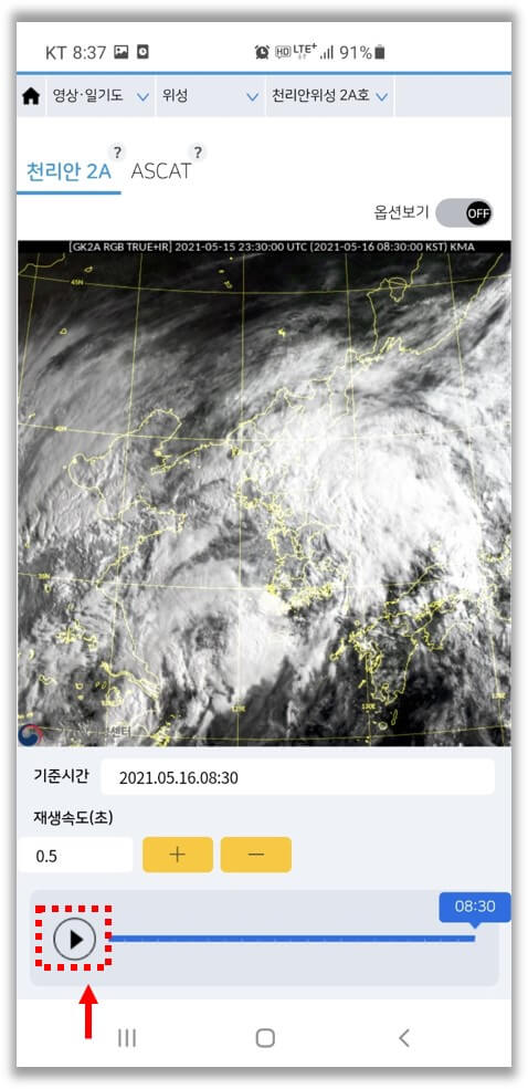 이번에는 위성영상을 확인해 보겠습니다. 마찬가지로 플레이 버튼을 재생하면 되는데요. 비구름이나 태풍이 어떻게 움직일지 예상해 볼 수 있겠죠.