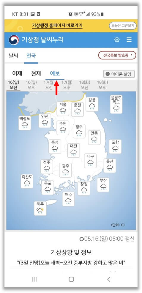 또한 '현재'에서 '예보'로 넘어가면 향후 3일간 예상 날씨를 오전/오후로 나눠서 확인할 수 있습니다.