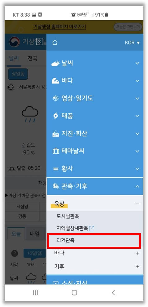 기상청 날씨누리에서는 과거 날씨도 조회해 볼 수 있습니다. 메뉴에서 관측·기후> 육상> 과거관측을 선택합니다.