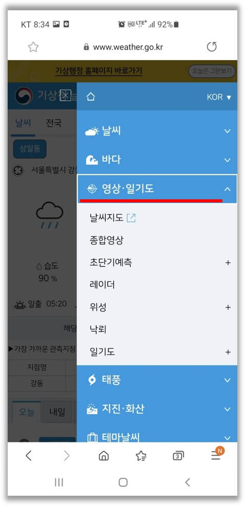 위성영상을 통해 단기간 날씨 예측도 가능합니다. 메인 페이지에서 우측 상단 메뉴를 클릭하겠습니다.